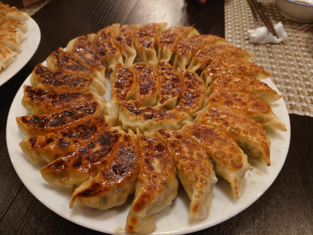 - フライパンが熱くなったら、一回火を止めて、餃子の底に油をしっかりとつけて外側から円を描くように置いていく。最後のほうは油がなくなるので、別皿に入れた油をつけてから置く。
