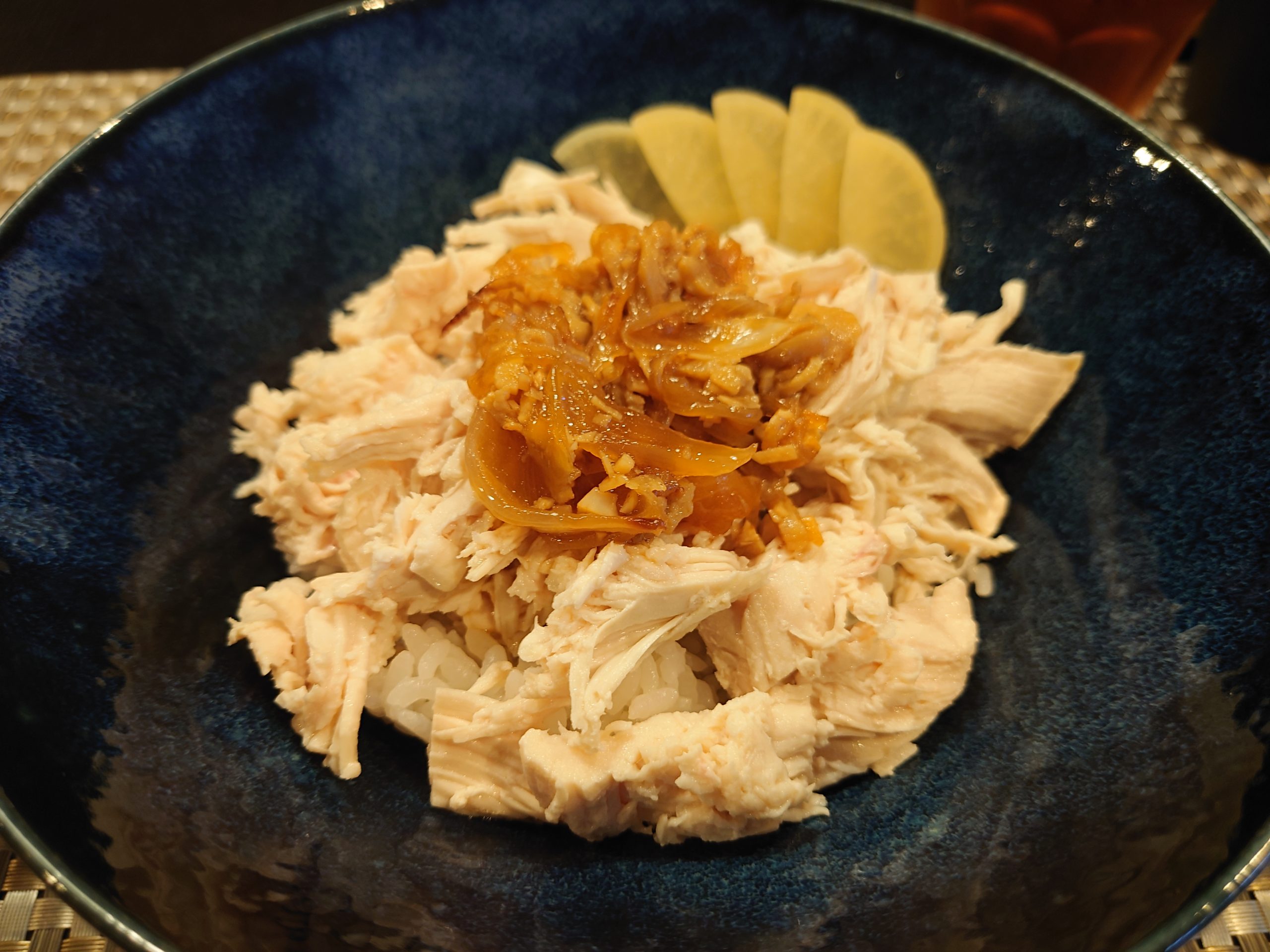 - どんぶりにご飯を入れ、⑨の胸肉をのせ、漬物を添える。